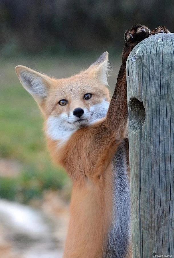The picture shows a fox. The fox appears to be in an upright position, with its paws on the edge of what looks like
