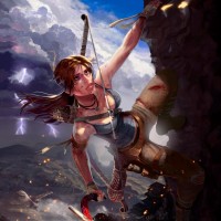 adventurous setting, which often involves exploration and combat. In this particular image, she appears to be navigating through a rocky environment with