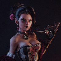 a female character with gothic or fantasy-inspired attire, featuring elements like corsets, chains, and what appears to be a pistol. She is holding the pistol close to her body, suggesting she might be in