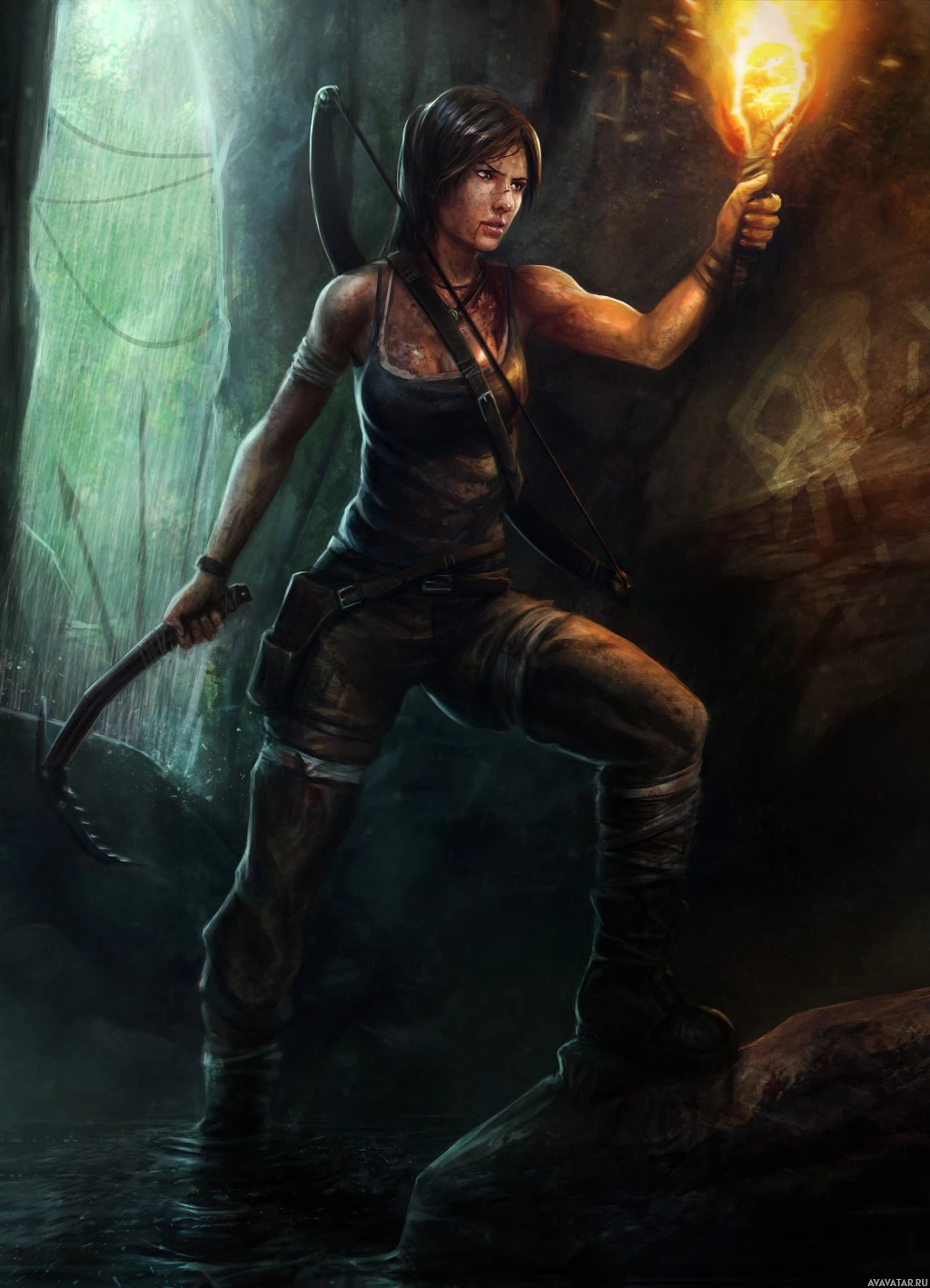 particular scene, she is holding a torch in one hand and a bow in the other, suggesting that she is either preparing to navigate through a dark area or about to engage in combat. The environment around her appears to be an underground cave or temple with stone walls and vegetation, which fits the typical setting of the "