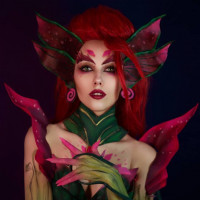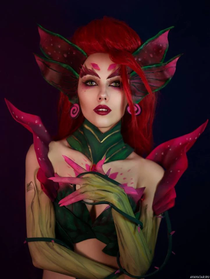 The image shows a person dressed as the character Zyra from