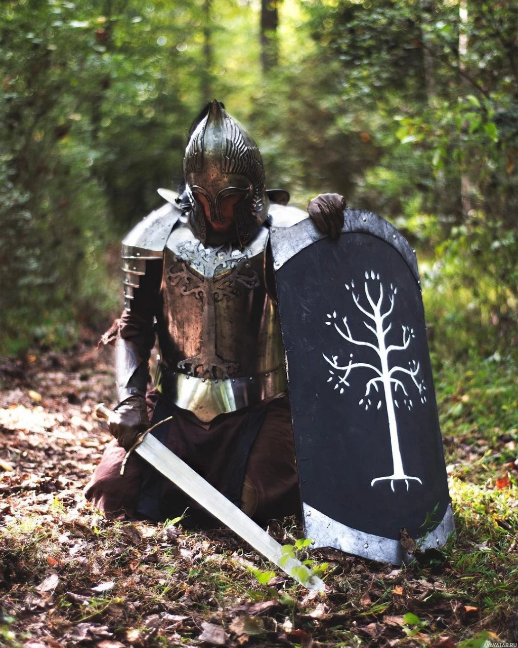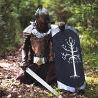 The image shows a person dressed in armor and holding a shield with a design that is reminiscent of Middle-earth from the "Lord of the Rings" series. This person appears to be engaged in cosplay, which involves dressing up as a character for fun or entertainment purposes. The outfit includes metallic