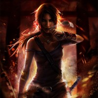 a dramatic background of fiery destruction, which is consistent with the adventurous and action-packed nature of her character. The image has a high level of detail and uses vibrant colors to convey a sense of urgency and excitement typical of