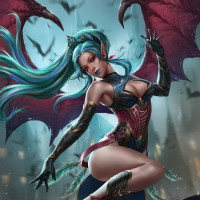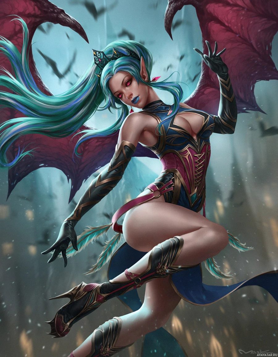 The image depicts a fantasy-themed character that appears to be a succubus, which is often associated with mythology and folklore. She has the upper body of