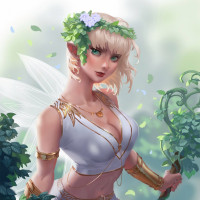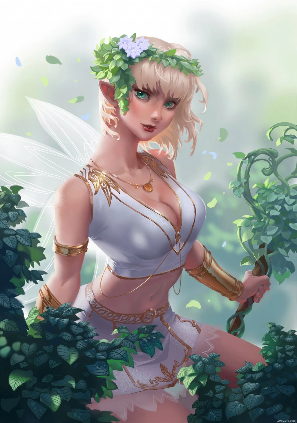 fairy folklore. The background consists of greenery with leaves and what appears to be mist or light, giving the scene