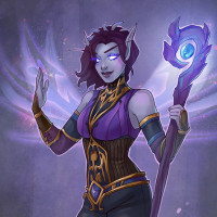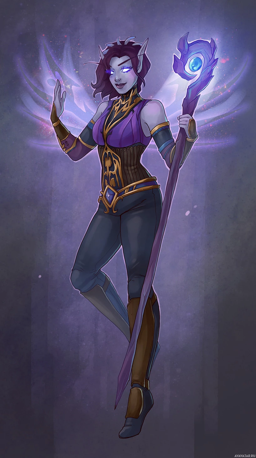 dark clothing and holding a wand or staff that has a glowing blue gem at the top. She also appears to have wings on her back, which suggests she may be some sort of