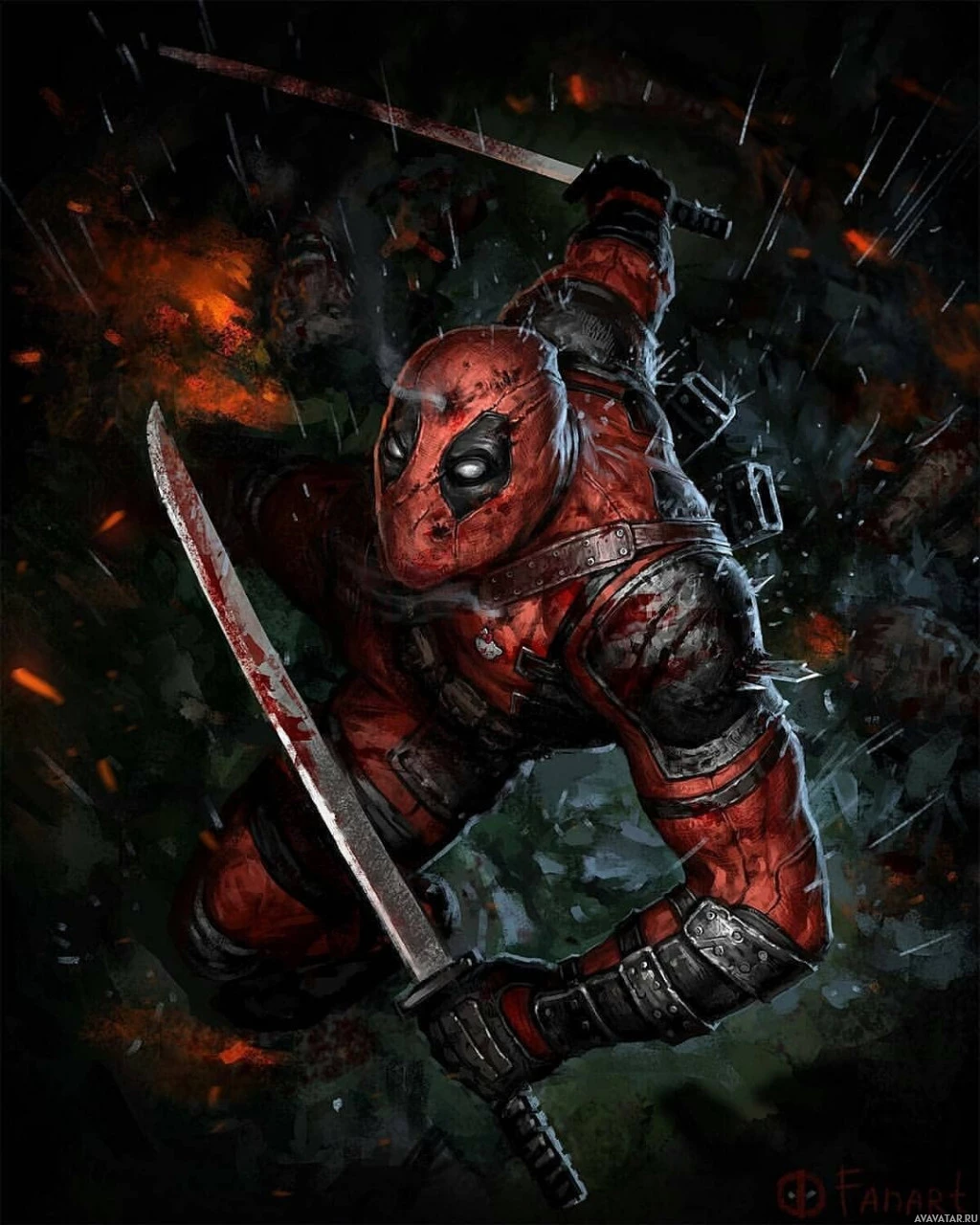 a dynamic pose, holding two large katanas with blood splattered on them, suggesting combat or intense action. The background includes elements such as a fire explosion and dark,