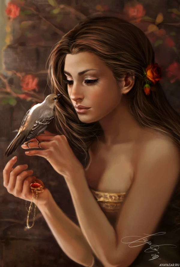 a young woman with her eyes closed, seemingly engrossed in the moment. She has long, flowing hair and is wearing what appears to be a dress with a vintage or historical style. In her hand, she holds