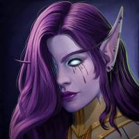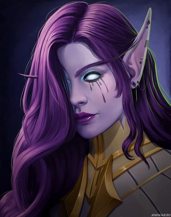 a fantasy character with purple hair, often referred to as "drow" in fantasy settings. This character is depicted with