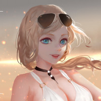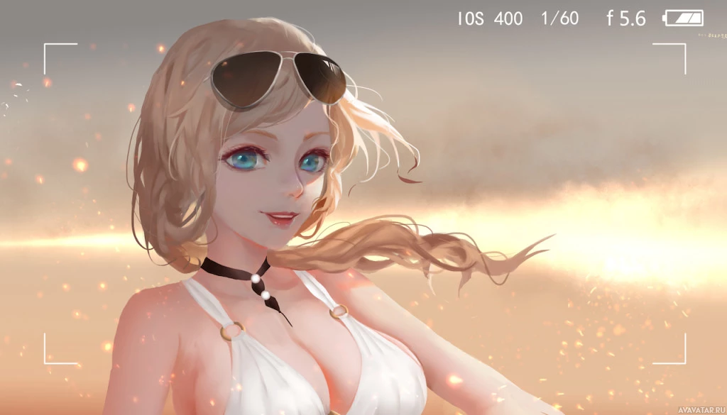 a female character with blonde hair wearing sunglasses and white swimwear. She appears to be in