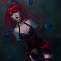 a black corset and stockings, giving her an elegant yet seductive appearance. The overall mood of the picture is moody and dreamlike.