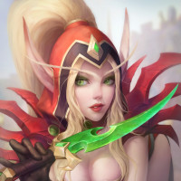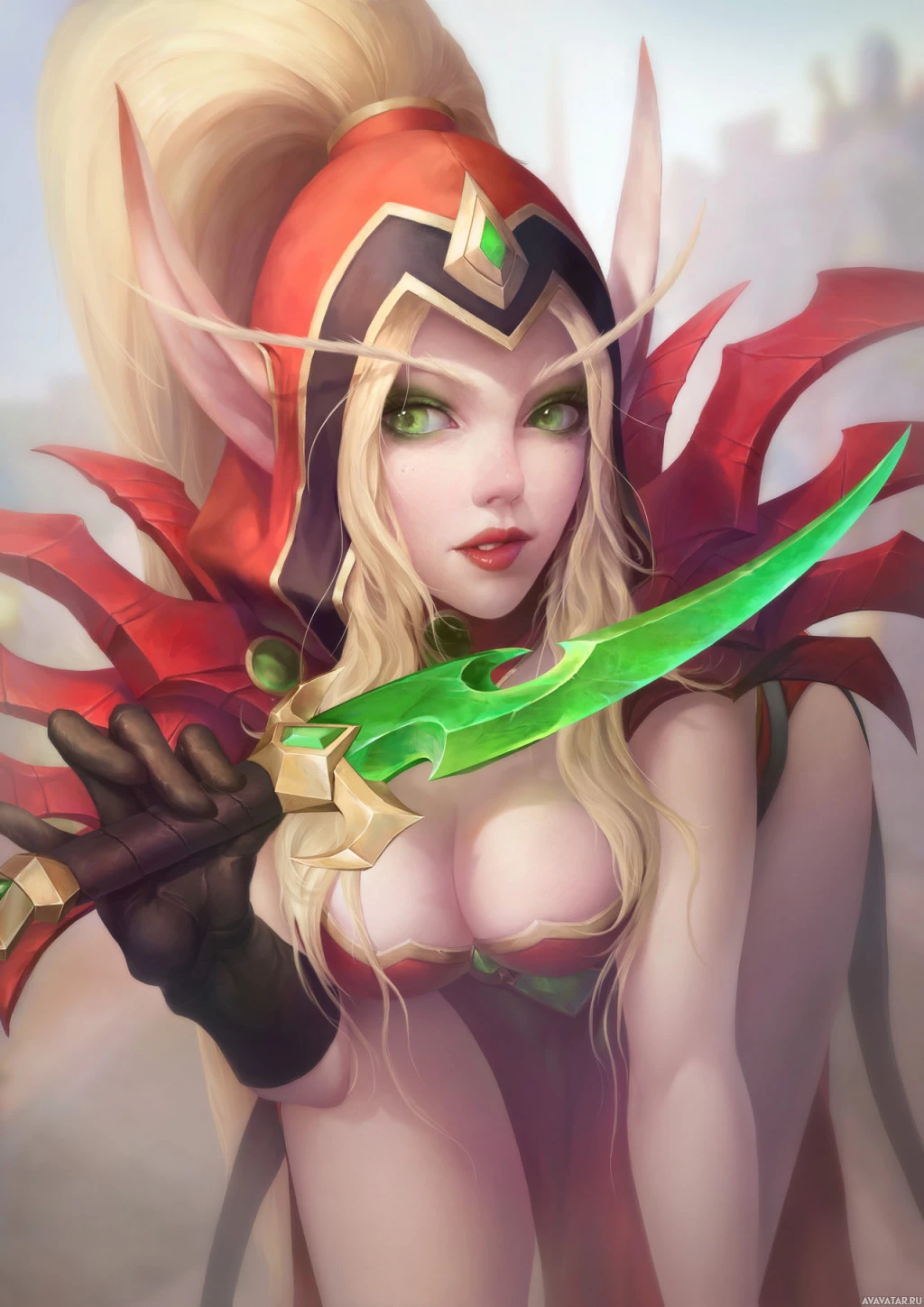 illustrated character who appears to be an elf from the fantasy universe of Warcraft. She has long