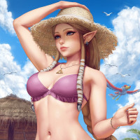 a straw hat and sunglasses, with a bikini top. There are also elements that suggest she might be in a tropical or vacation setting, such as