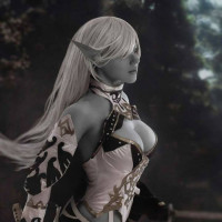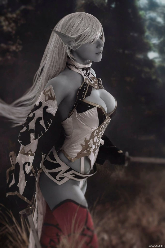 The image depicts a character with white hair, wearing fantasy-style armor and a cape. This character appears to be designed in the style of a drow, which is typically associated with dark elves in fantasy settings. The setting looks like it could be a forest or a mystical outdoor environment.