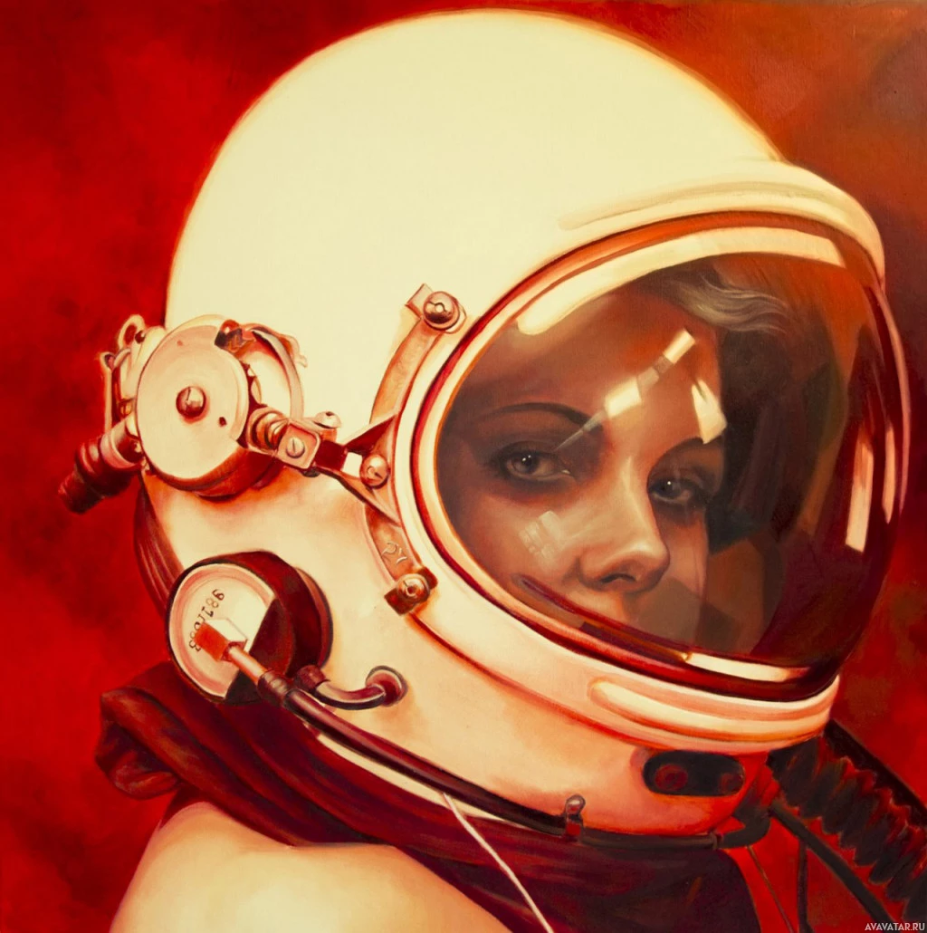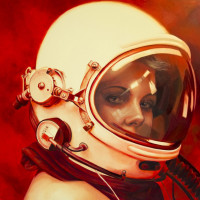 The image shows a portrait of a person wearing an astronaut's suit and helmet. They are depicted against a red background, which gives the impression of being in space or a space-themed setting. The astronaut is looking towards the viewer with a calm and focused expression.