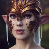 golden hues that match the rest of her makeup and costume. Her expression is neutral, and she seems to have long hair, styled in what looks like braids. The style of the image is highly stylized and could be indicative of a video game or concept art for fantasy media. The overall impression is that of a character from a world where magic, mythical creatures, and advanced technology coexist.