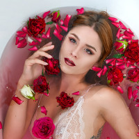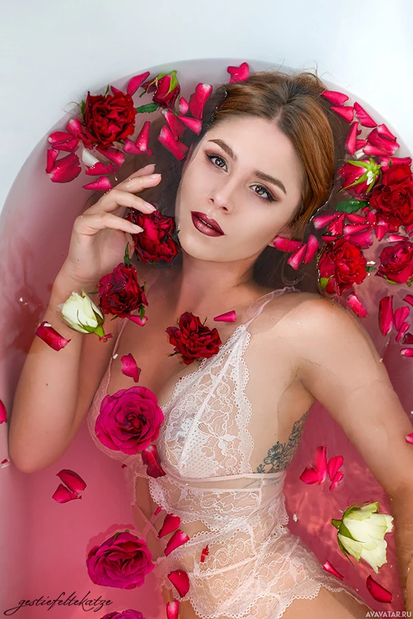 The image features a woman sitting in what appears to be a bath filled with pink rose petals. She is wearing a lace bodysuit and her makeup includes dark lipstick and dramatic