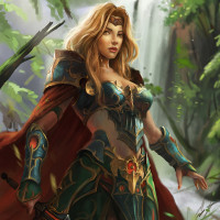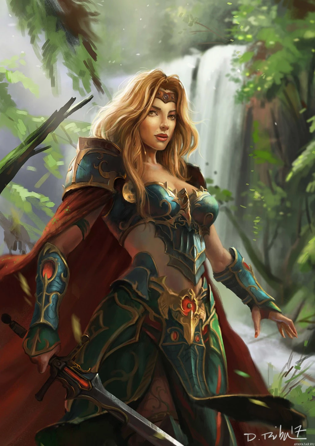 a female character, who appears to be a fantasy or mythological warrior. She has