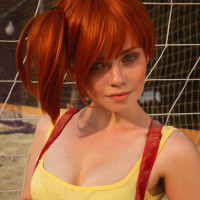 In the image, there is a person posing for a photograph. The individual appears to be dressed in a cosplay costume that resembles Misty from a popular