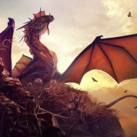 a fantasy scene with a dragon as the main subject. The dragon is perched on top of what appears to be