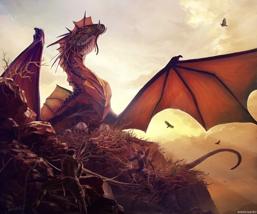 a small bird flying near the dragon's head, suggesting some level of interaction between different creatures. The overall mood of the image is serene and majestic.