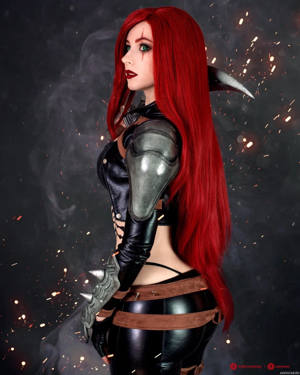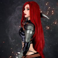 cosplay attire that closely resembles her in-game outfit, which includes a black and red armor with a sword sheath at the hip. The character is standing confidently against a backdrop that emulates flames or smoke, enhancing the fantasy and action elements typically associated with this