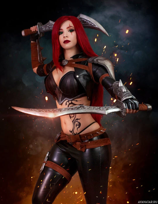 League of Legends," known as Katarina. She is depicted in a cosplay style, dressed in her