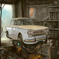 mechanical components scattered around the area. There's also a character visible in the background, seemingly working on a project or examining something within the garage. The artwork conveys a sense of intrigue and a blend of technology and classic automotive design elements, suggesting a story that combines nostalgia with