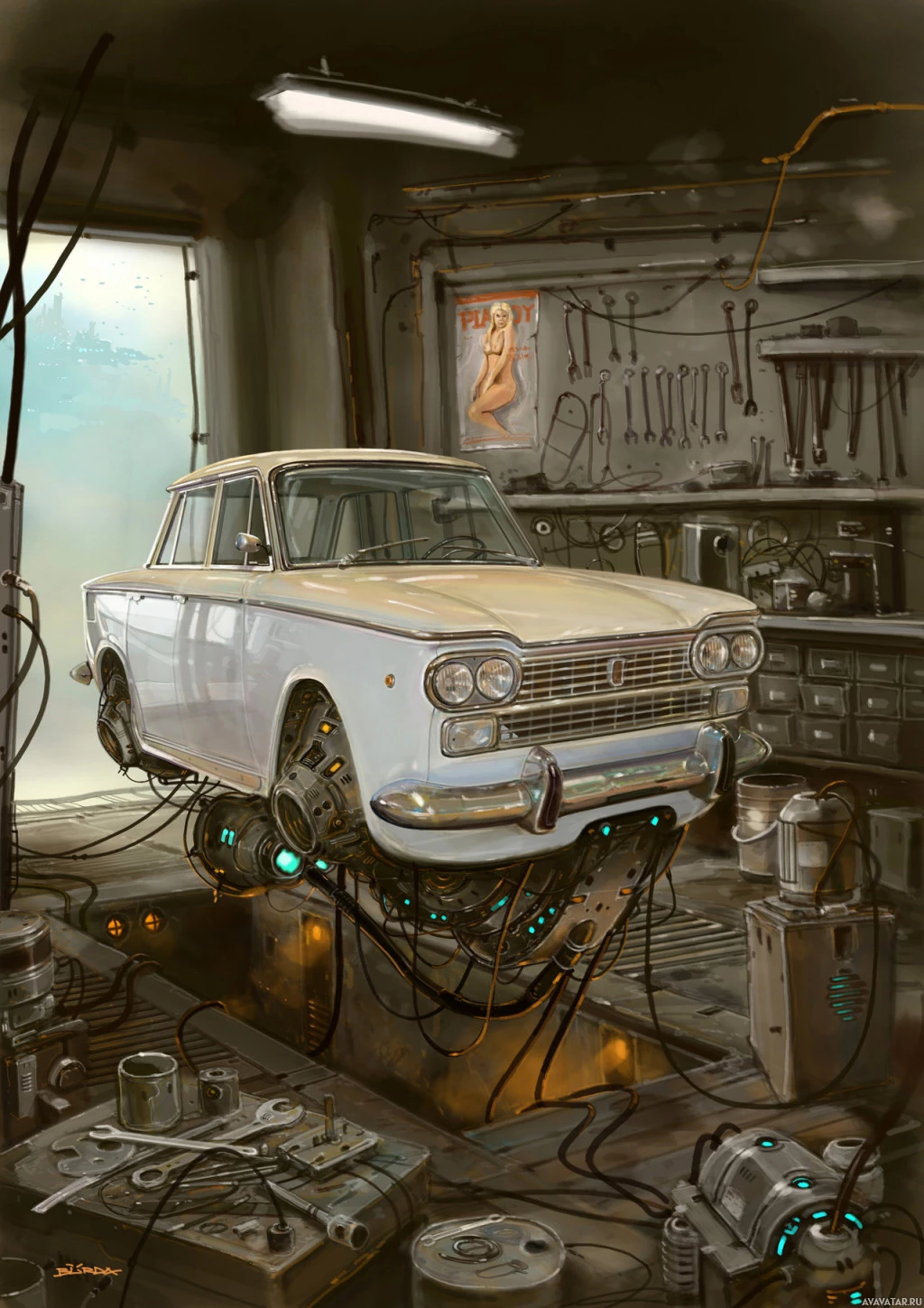 science fiction. A classic white car with chrome detailing is positioned in front of a workshop or garage setting that appears to be equipped with