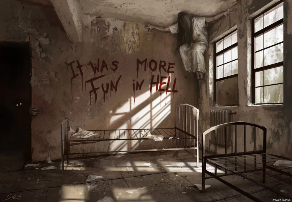 the sense of decay. On the far right wall, there is graffiti that reads "It was more fun in hell" with additional symbols or words above it. The overall atmosphere of the image conveys