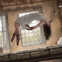 a female character hanging from the ceiling of what appears to be a dilapidated, abandoned room. She is dressed in white and seems to be suspended by her hands, which are cuffed together, suggesting she might be chained or otherwise restrained. The setting includes old beds with stained mattresses, rusted