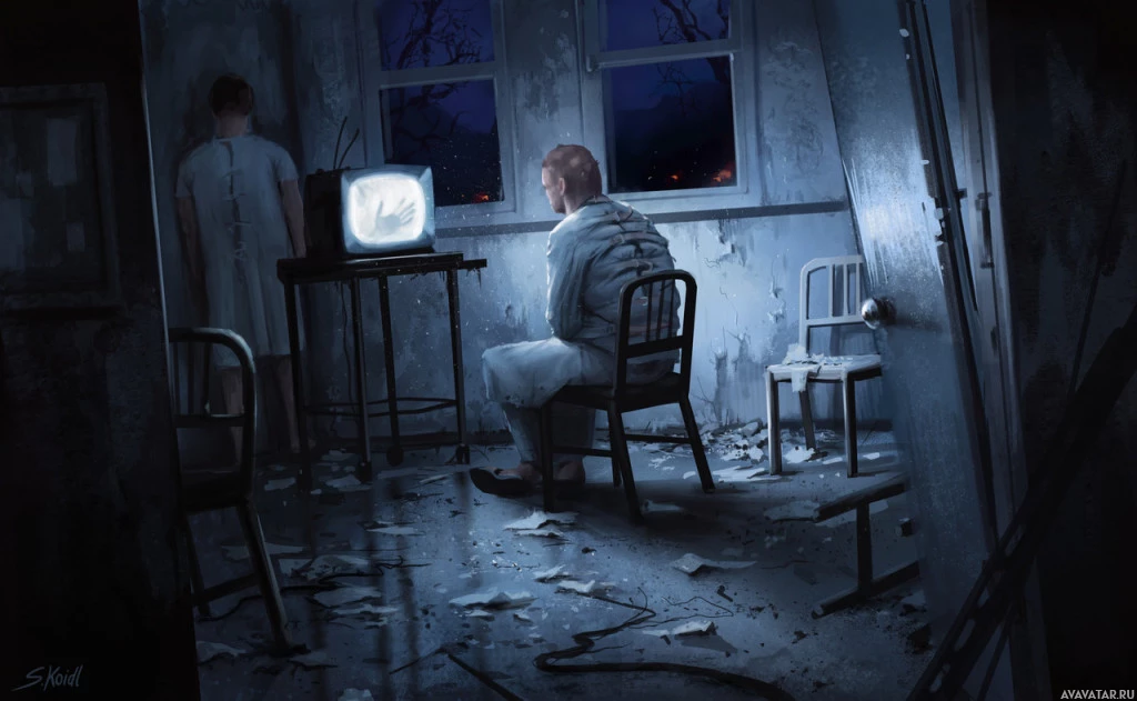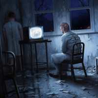 television set placed in front of him. To his left, another figure stands behind the man, looking out of a window with curtains drawn, and appears to be observing the outside darkness. The room is in disrepair with peeling wallpaper, broken furniture, and