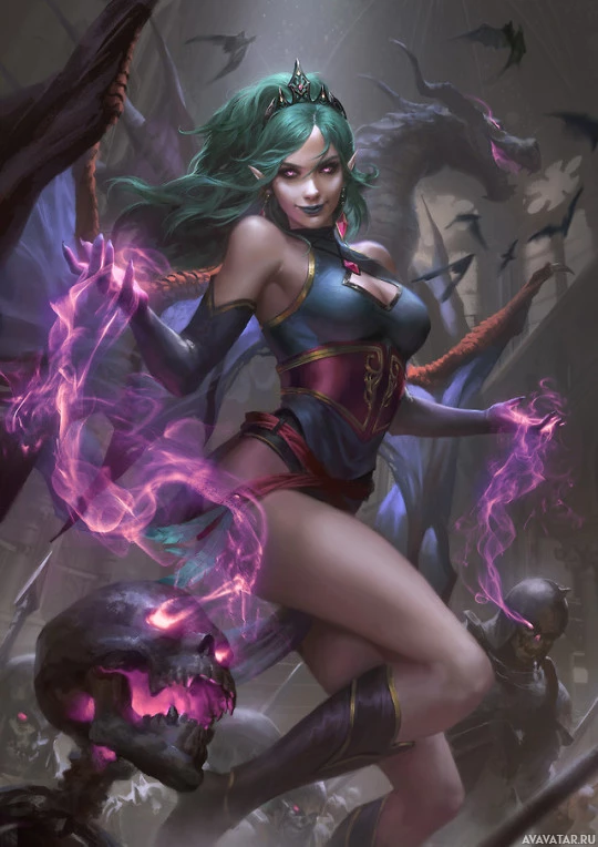 energy effects emanating from her hands, indicating that she might be casting spells or performing magic. In the background, there are skeletal figures, suggesting a dark or