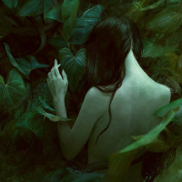 dark hair, shown from behind. She appears to be immersed in a dense vegetation of large