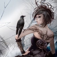 nature with fantasy and possibly gothic themes due to the character's attire and the presence of the crow.