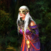 white hair and a flowing dress. She wears a mask over her eyes, which gives her an enigmatic or mystical appearance. Her attire suggests she might have