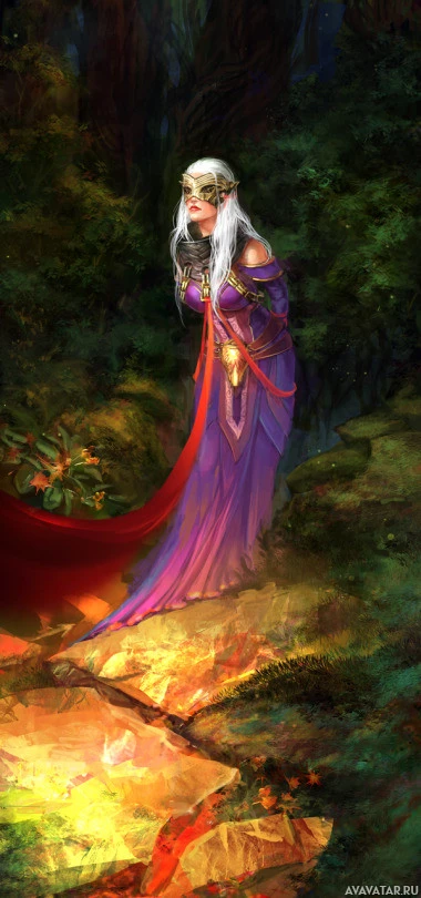The image depicts a fantasy-themed artwork. There is a figure in the foreground who appears to be an elderly woman with long