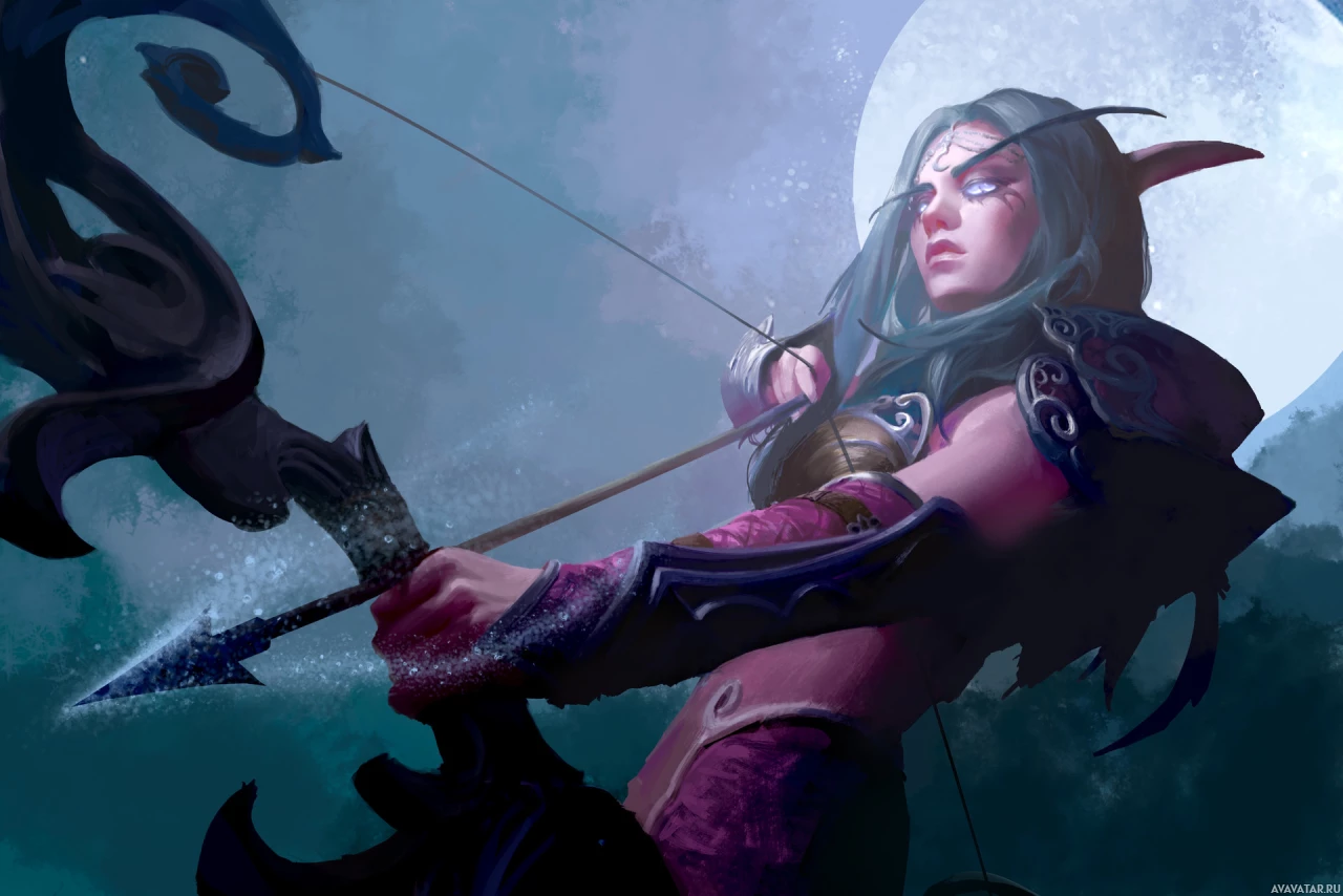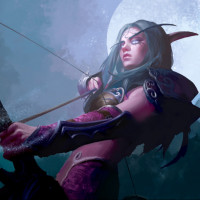 dark hair and pointed ears, typical of the Drow elves. They are holding a bow and arrow, suggesting they may be involved in combat or hunting. The background features a mystical moonlit scene with