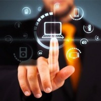 savvy environment, possibly an office or a tech conference setting. The person's fingers are extended towards the screen of the device he is touching, indicating interaction with