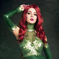 The image shows a person dressed in a cosplay outfit designed to resemble the character Poison Ivy, who is known for her green skin and plant-themed costume from