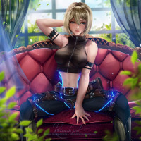 black top with accents that suggest some form of armor or battle gear, including straps and buckles around her shoulders and waist. Her pose, with one hand on her hip and the other resting on