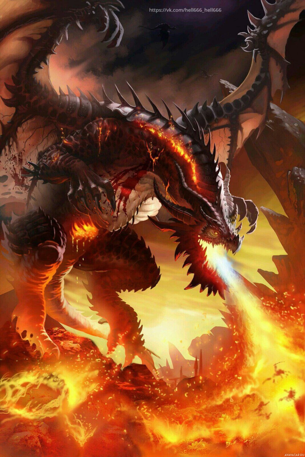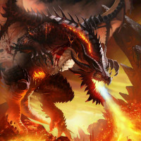 a fierce expression, its wings spread wide and flames coming out of its mouth or nostrils. It stands on an inferno, with fire surrounding it, suggesting that the dragon might be causing the destruction around it or emerging from the chaos itself. This kind of image is often associated with
