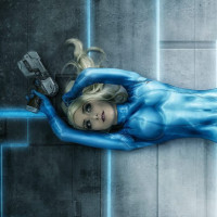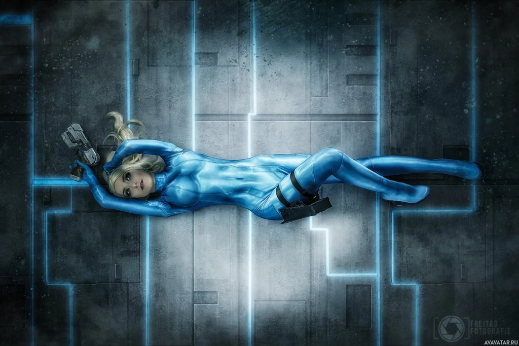 a female character with blonde hair, lying on her back and holding what appears to be a pistol. She is wearing a sleek, blue bodysuit that might suggest she's a superhero or an action figure