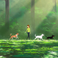 a young girl walking through a dense forest with a dog. The girl appears to be in mid-stride and has a backpack on. There are two dogs accompanying her: one larger dog walking ahead of her and another smaller dog following behind. They seem to be enjoying their walk together. The forest is lush, filled with tall trees that give off