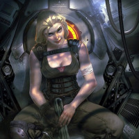 The image shows a female character with blonde hair, seated within what appears to be the cockpit of a spacecraft or military vehicle. She is wearing a combat uniform and has a pistol on her lap. Her pose suggests confidence or readiness for action. The setting includes various control panels and screens that indicate advanced technology.