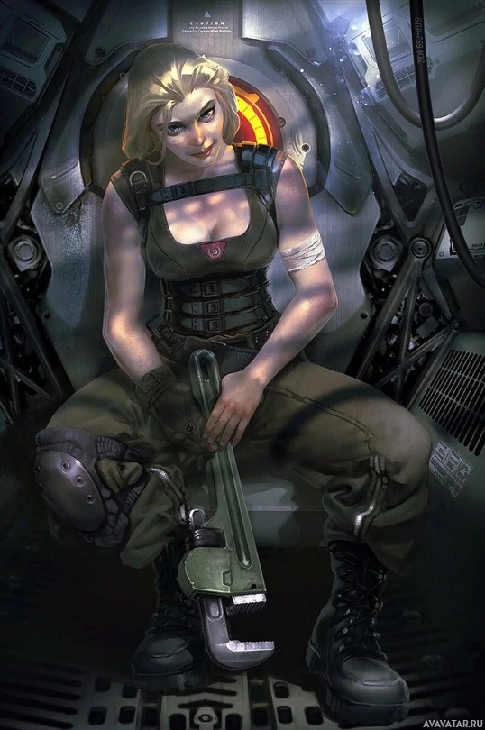 На картинке изображена женщина с светлыми волосами, сидящая в кабине космического корабля или военного транспортного средства. На ней боевая форма и пистолет на коленях. Ее поза предполагает уверенность или готовность к действию. Обстановка включает в себя различные панели управления и экраны, которые указывают на передовые технологии.
