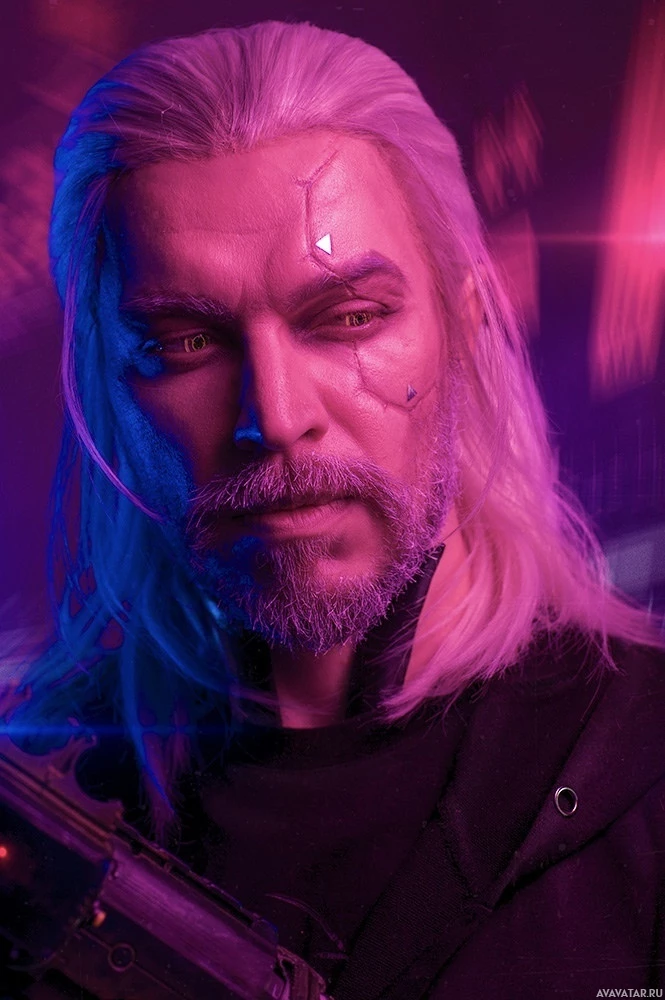 На картинке изображен персонаж, который, по-видимому, является Геральтом Ривии из серии «Ведьмак». Он держит то, что выглядит как пистолет, и имеет серьезное выражение лица. Фон предполагает городскую обстановку с неоновыми огнями, которая согласуется с темой фэнтези нуар, часто связанной со вселенной «Ведьмака».