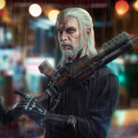 Geralt of Rivia, the protagonist of the series. He is depicted holding two different types of weapons, one in each hand, which is characteristic of his versatile