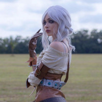 video game. The individual is wearing a costume that resembles Ciri's attire, including a medieval-style dress with leather elements and a sword on the hip, which are both part of the character's