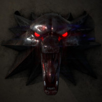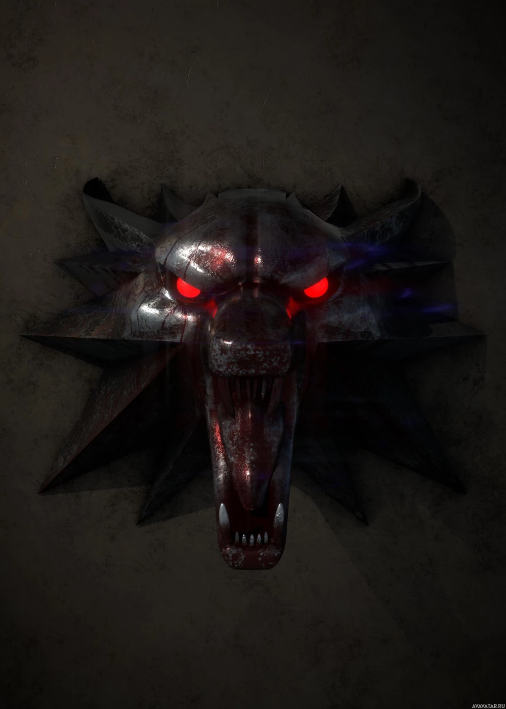 the coat of arms from the "The Witcher" series. It consists of a wolf's head wearing what appears to be